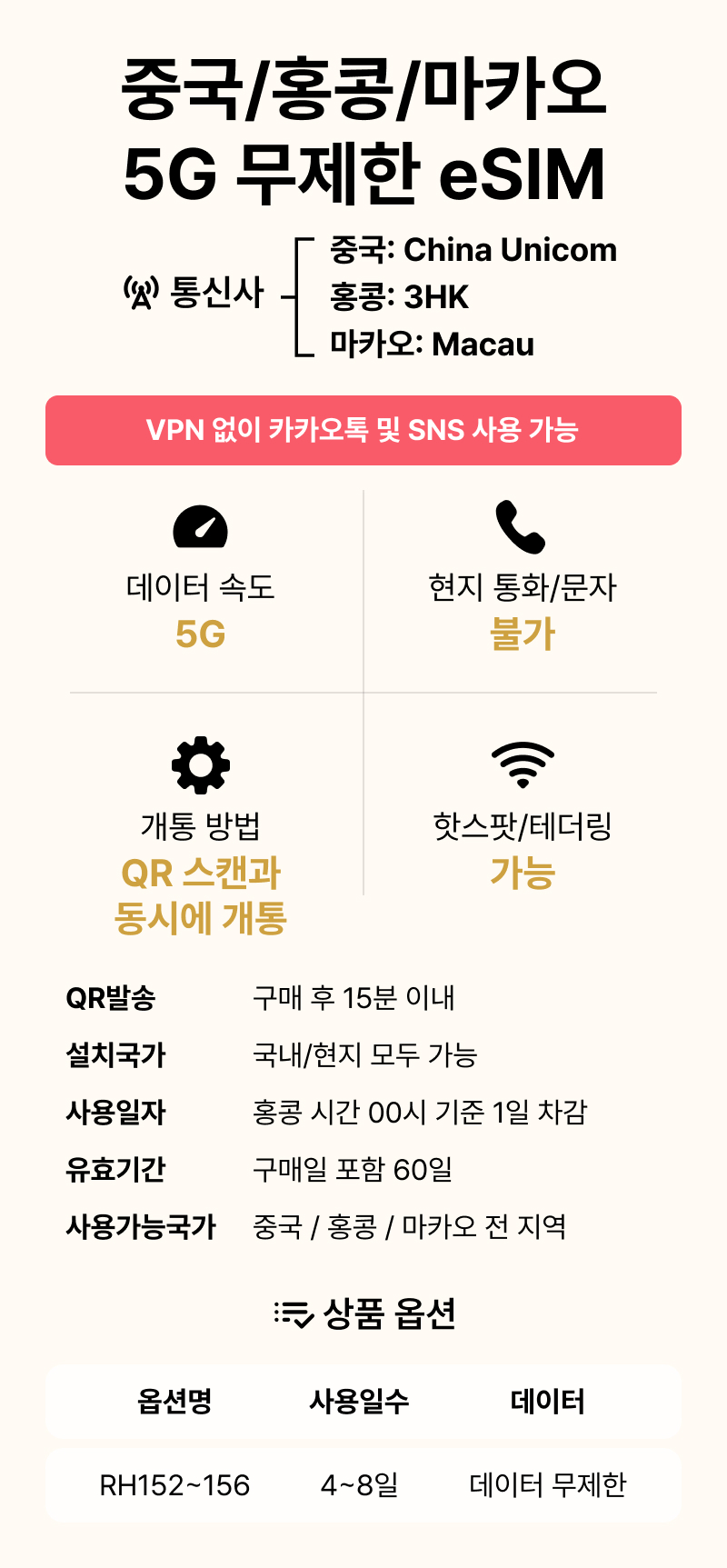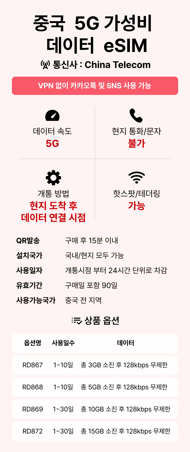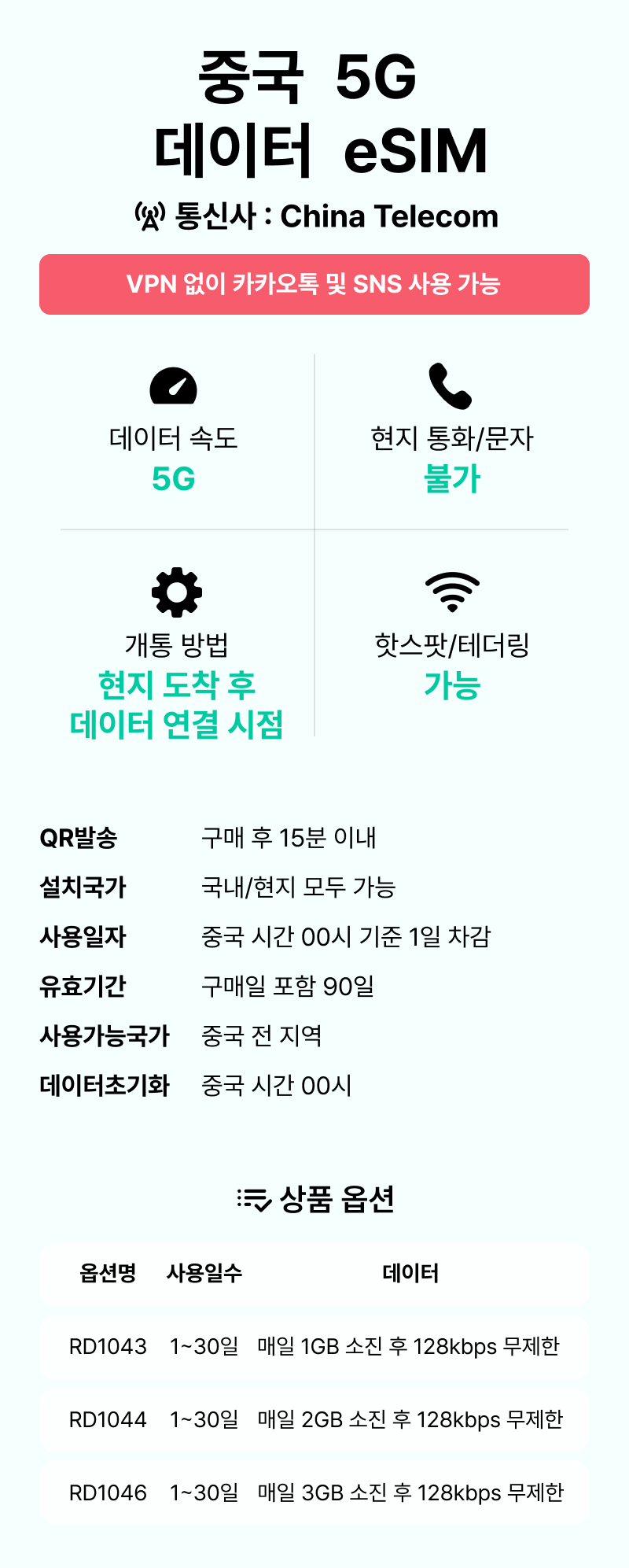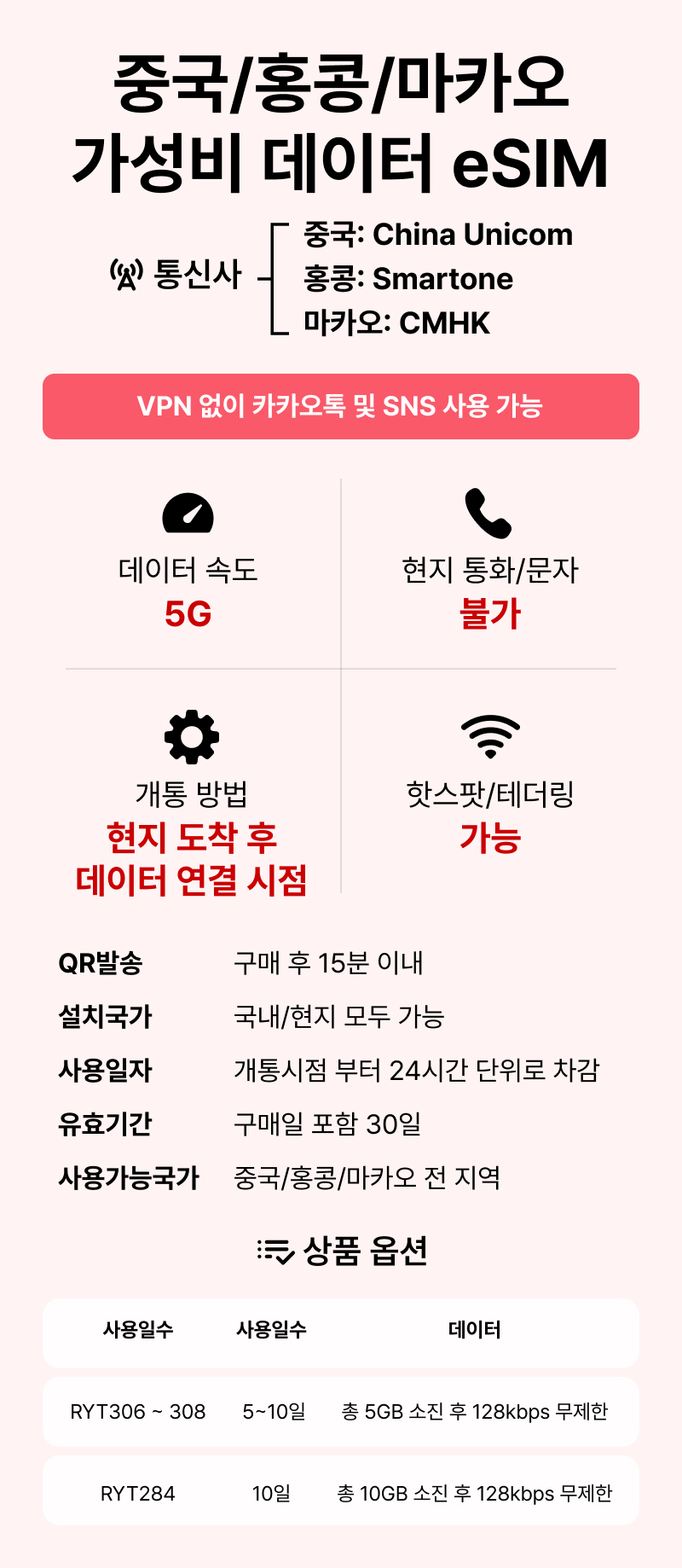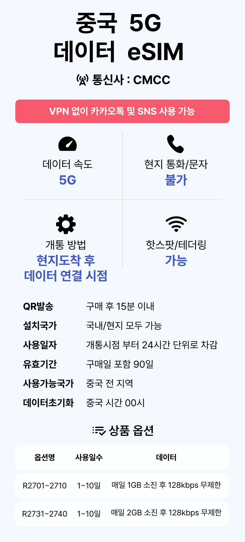 [중국/esim] QR코드 사용 이심. 5G 속도 데이터무제한 일자별선택, 중국,홍콩,마카오 전지역 사용 가능