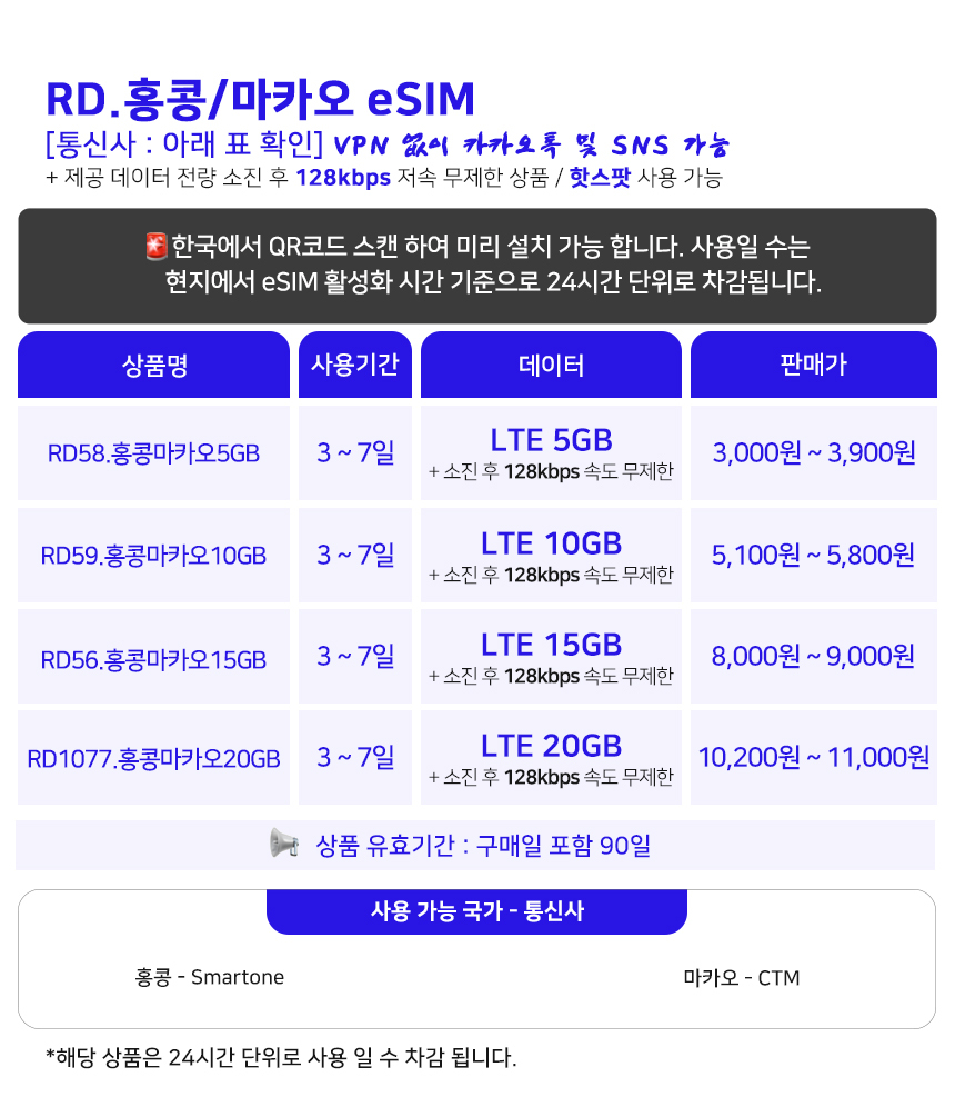 [홍콩마카오/esim] QR코드 사용 이심. 5G 속도 데이터무제한 일자별선택, 홍콩 마카오 전지역 사용 가능